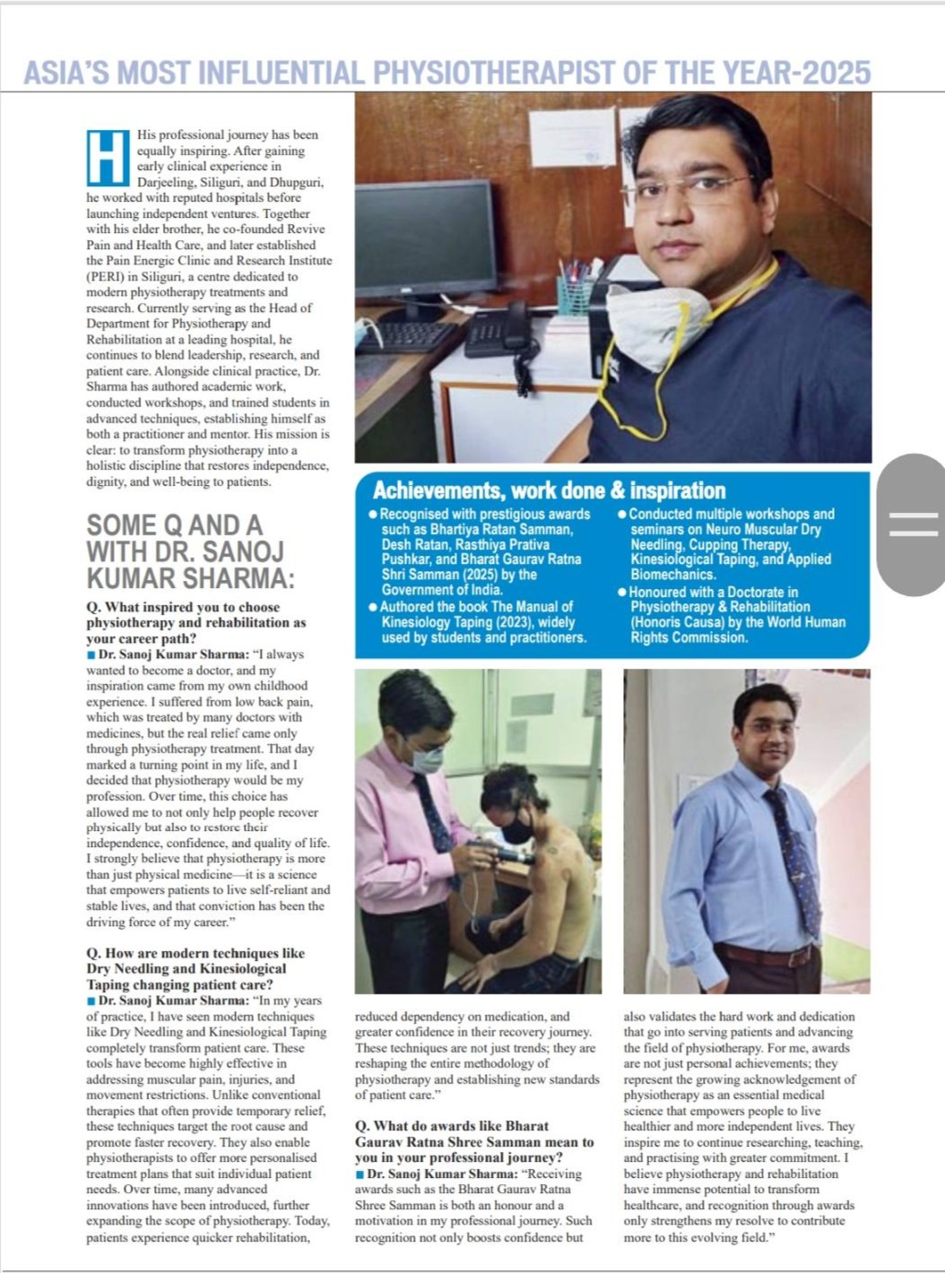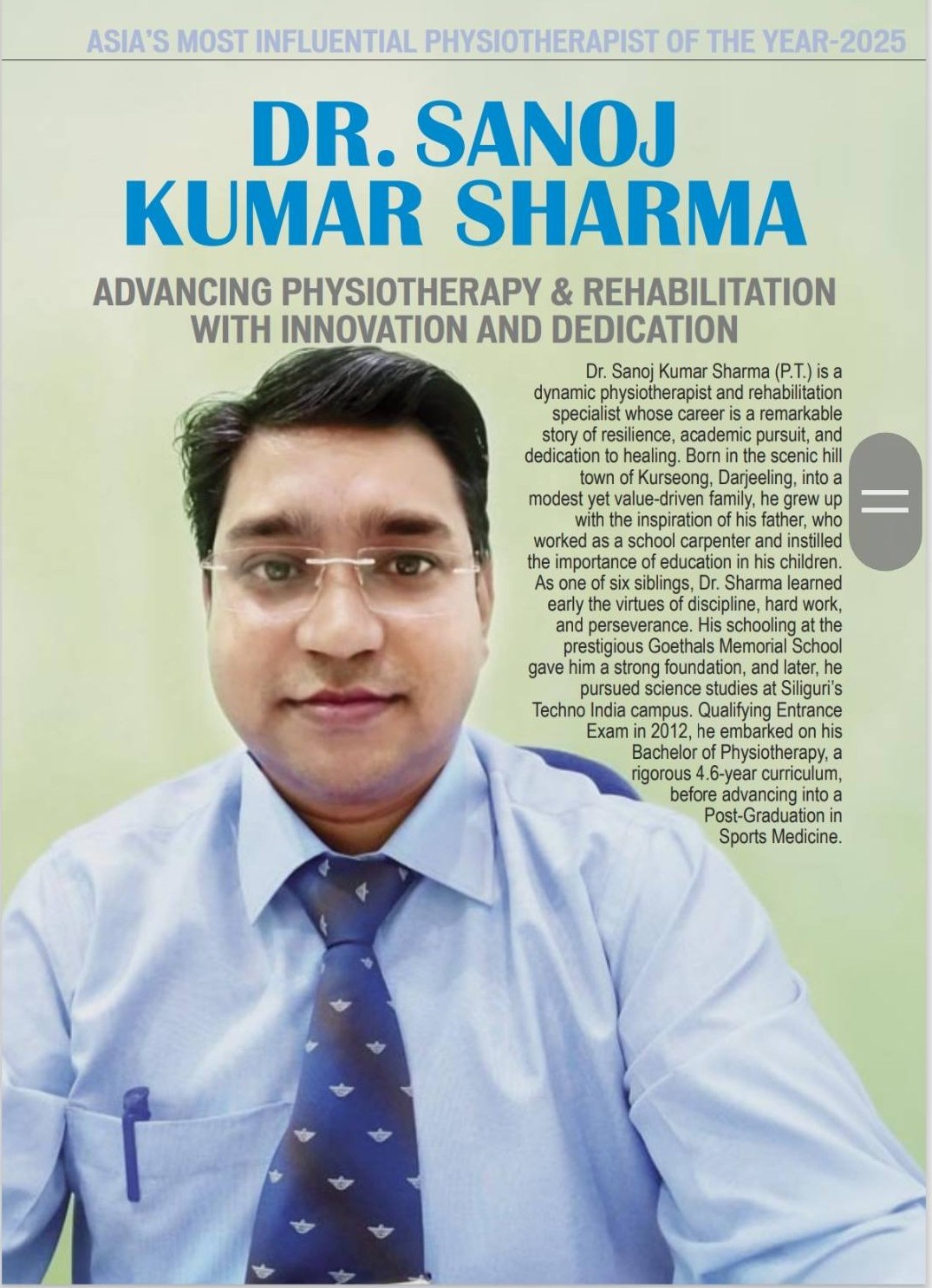 Dr. Sanoj Kumar Sharma is a distinguished Physiotherapist and cosmetologist based in Siliguri, West Bengal, with over 10 years of experience in the field. He serves as the Medical Director of PERIMEDICA and is a consultant specializing in pain management, sports medicine, physiotherapy, skin, hair, laser treatments, and cosmetology. He is Sr. consultant of Clinical Cosmetology.